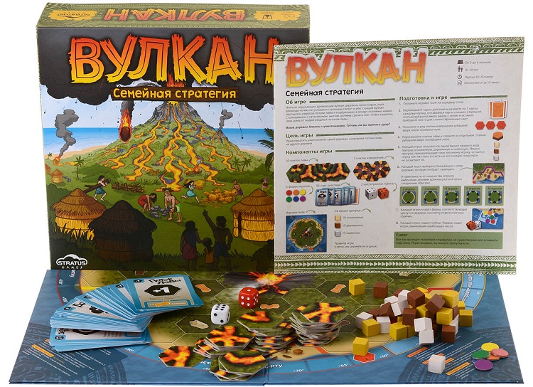 «Вулкан» - это локализованная издательством Magellan настольная игра Eruption (Извержение) от американской компании Stratus Games. Это классическая несложная стратегическая конкурентная игра, где каждый участник спасает собственную деревню от растекающейся вулканической лавы, направляя ее на деревни соперников.