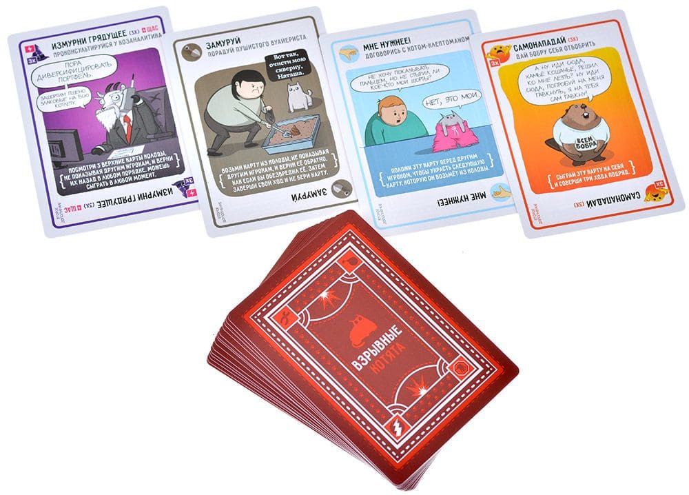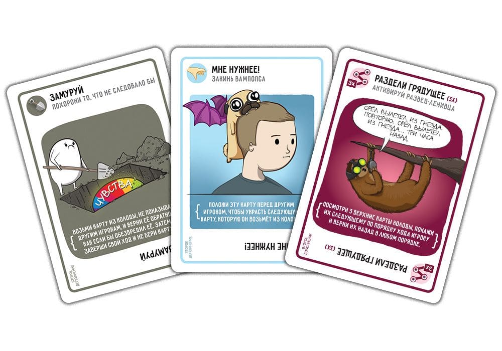 - Замуруй. Игрок завершает своей ход, при этом посмотрев верхнюю карту в колоде и переложив ее в любое случайное место.