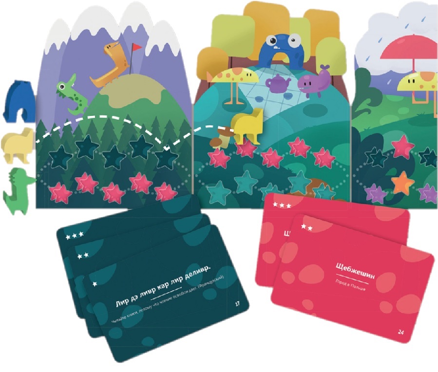 - 195 карт заданий с русскими и иностранными скороговорками, необычными географическими названиями, забавными именами и любопытными словами и фразами из разных уголков мира;