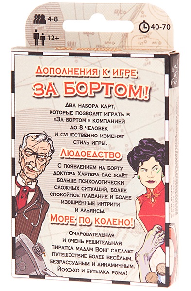 Сразу 2 дополнения к настольной игре «За Бортом!» в одной коробке: «Море по колено» и «Людоедство». Они открывают новые возможности: