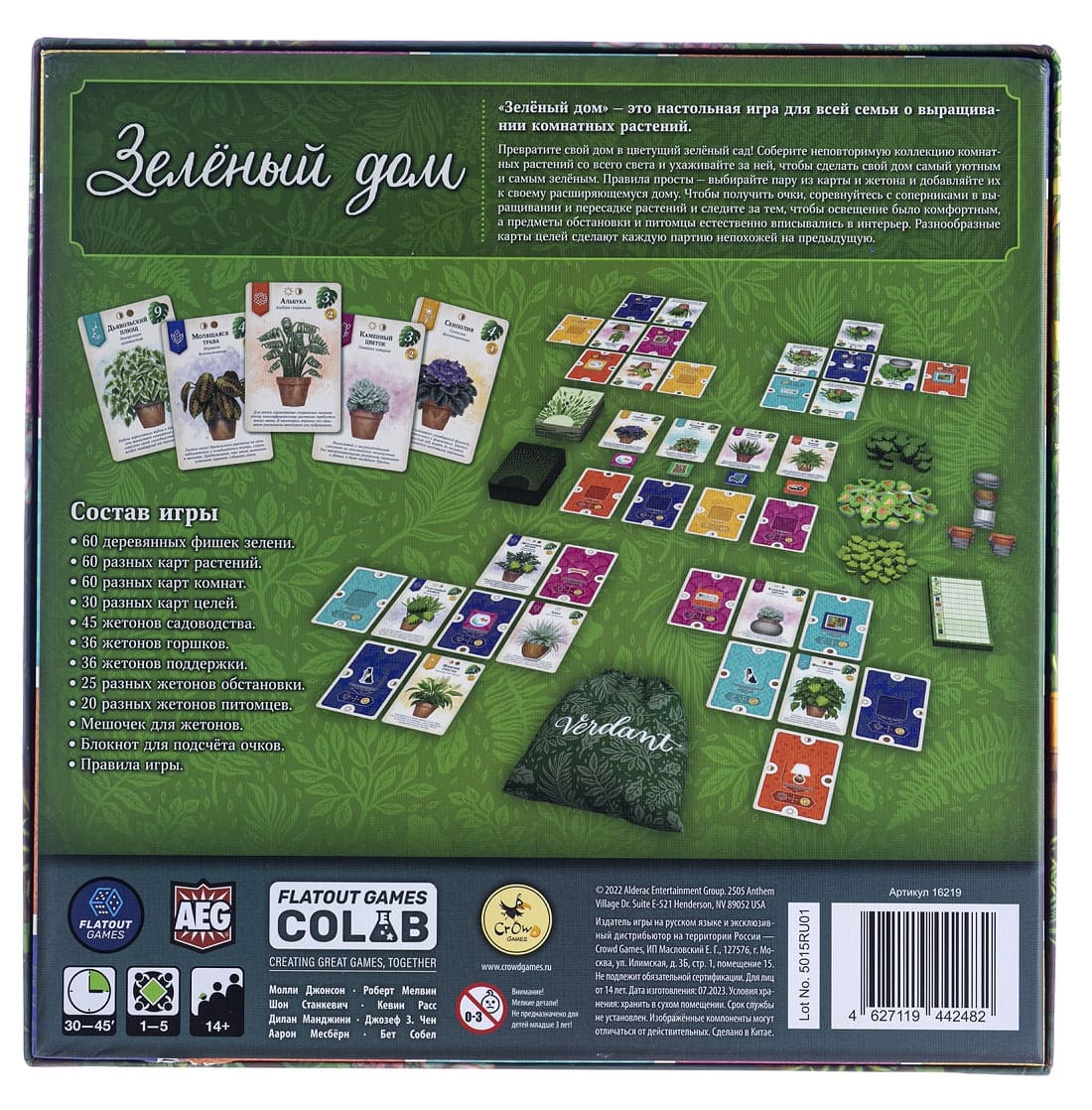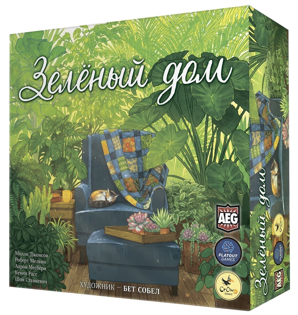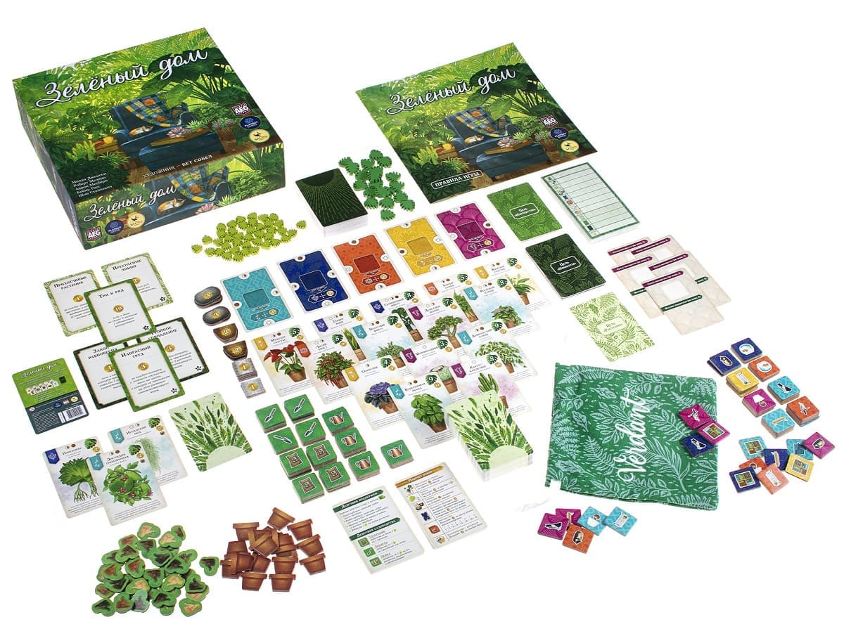 «Зеленый дом» — настольная игра-головоломка в которой участникам предстоит превратить свое жилище в цветущий сад! Для этого необходимо собрать огромную коллекцию комнатных растений из различных частей света, разместить их в разных комнатах своего дома и ухаживая за ней, сделать свой дом самым зелёным. Залог успеха - в правильном расположении карт комнат и карт растений, жетонов предметов интерьера и домашних животных.