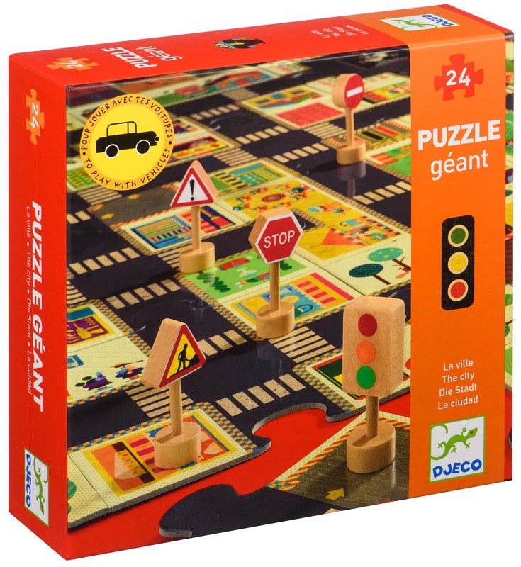 Пазл-гигант «Дорога» от французской компании Djeco – это возможность собрать несколько вариантов плана городских улиц с дорогами для машин и переходами для пешеходов. Собранные воедино детали пазла составляют полотно размером 100 х 63 см, которое ребенок может использовать для игры в машинки. Однако, варианты трасс могут быть различные, что поможет развить фантазию ребенка, а также научится составлять из отдельных элементов целостную конструкцию.