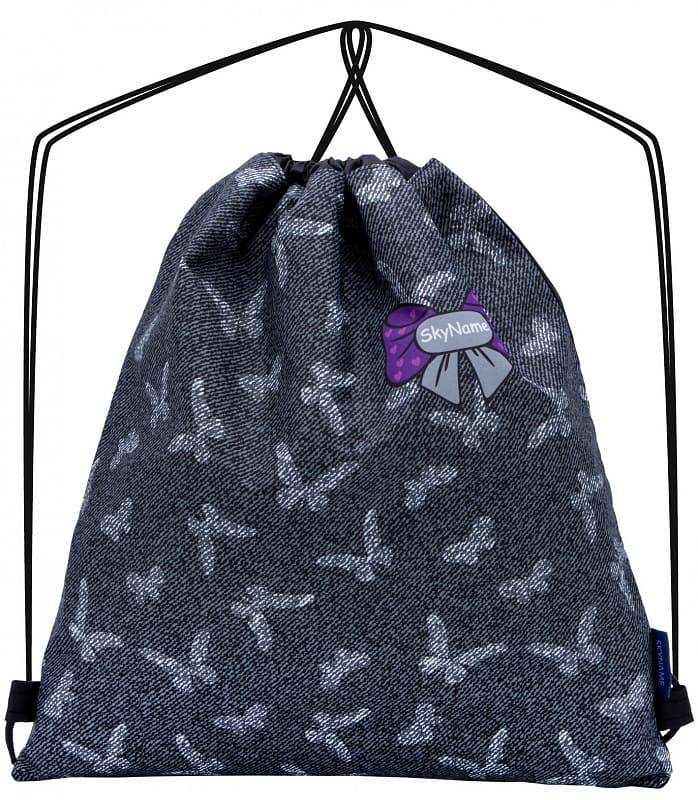 Школьный мешок для сменной обуви SkyName M-147 серого цвета украшен силуэтами бабочек. Материал - полиэстер. Горловина мешка затягивается на шнурки, которые также служат ручками для переноски. Размер мешка в разглаженном состоянии 40 на 45 сантиметров.