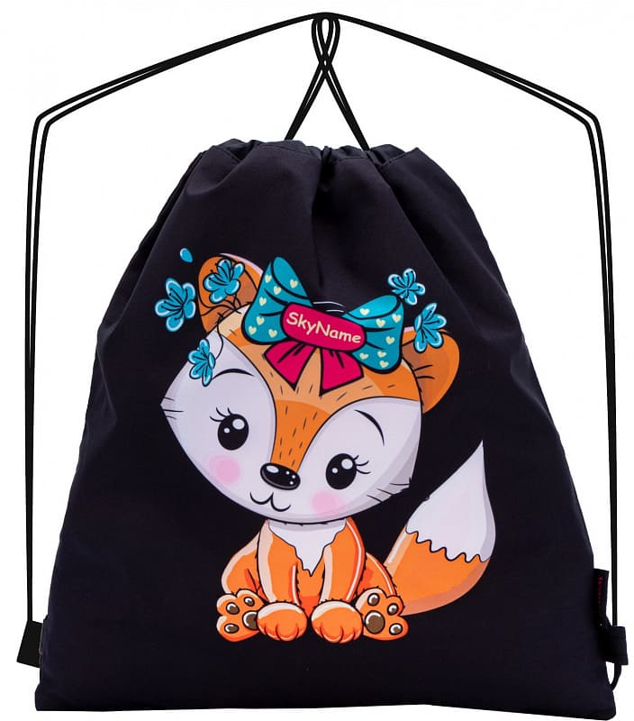 Школьный мешок для сменной обуви SkyName M-149 черного цвета и рисунком лисенка. Материал - полиэстер. Горловина мешка затягивается на шнурки, которые также служат ручками для переноски. Размер мешка в разглаженном состоянии 40 на 45 сантиметров.