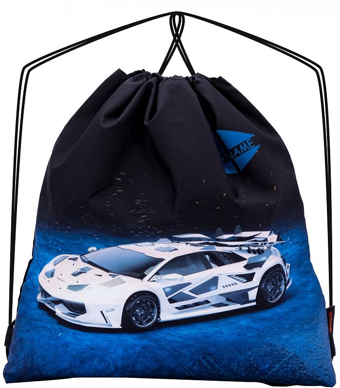 Школьный мешок для сменной обуви SkyName M-158 с рисунком белого спорткара на синем ночном фоне. Материал - полиэстер. Горловина мешка затягивается на шнурки, которые также служат ручками для переноски. Размер мешка в разглаженном состоянии 40 на 45 сантиметров.