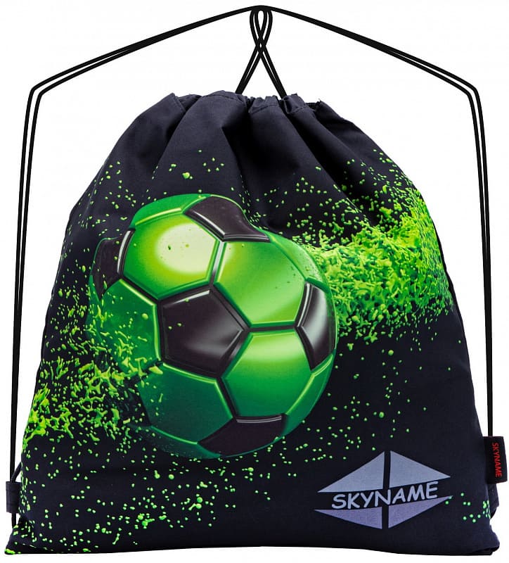 Школьный мешок для сменной обуви SkyName M-161 с рисунком зеленого футбольного мяча. Материал - полиэстер. Горловина мешка затягивается на шнурки, которые также служат ручками для переноски. Размер мешка в разглаженном состоянии 40 на 45 сантиметров.