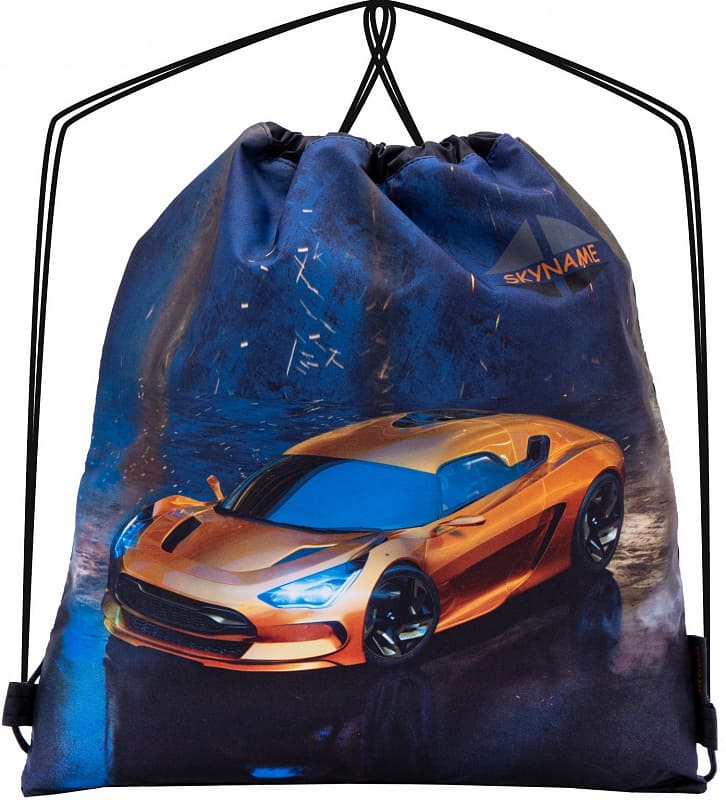 Школьный мешок для сменной обуви SkyName M-164 с рисунком оранжевой гоночной машины. Материал - полиэстер. Горловина мешка затягивается на шнурки, которые также служат ручками для переноски. Размер мешка в разглаженном состоянии 40 на 45 сантиметров.