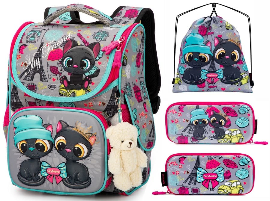 Школьный ранец для девочки первоклассницы и учениц 2-4 классов SkyName 2072 с черными котятами имеет классическую форму и разборную конструкцию, позволяющую раскладывать ранец в плоскую форму, когда он не используется. Ранец изготовлен из современных прочных материалов, что позволило довести вес ранца до 820 грамм. Он имеет стильную серую расцветку с красными вставками и украшен рисунком котенка.