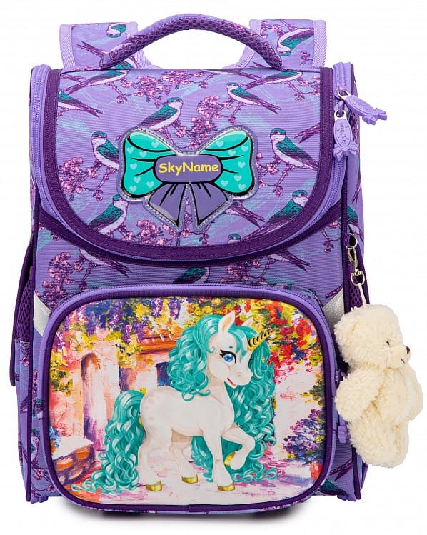 Школьный ранец для девочки первоклассницы и учениц 2-4 классов SkyName 2075 имеет классическую форму и разборную конструкцию, позволяющую раскладывать ранец в плоскую форму, когда он не используется. Он имеет нежную фиолетовую расцветку и украшен ярким 3D-рисунком единорога на торцевом кармане ранца.