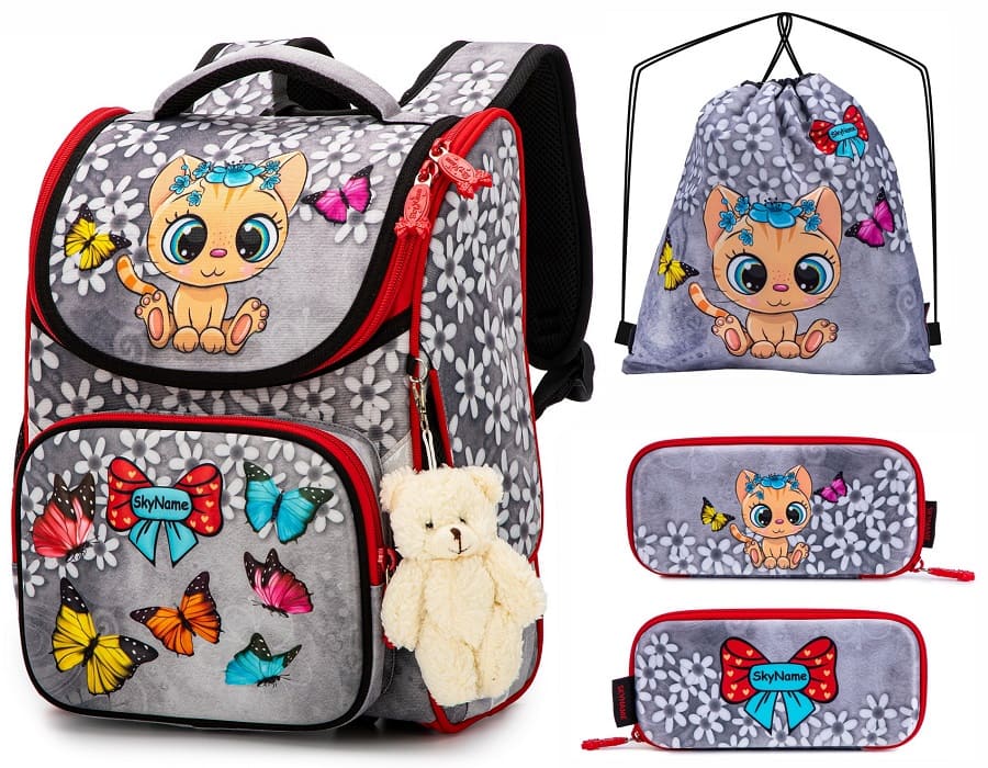 Школьный ранец для девочки первоклассницы и учениц 2-4 классов SkyName 2076 имеет классическую форму и разборную конструкцию, позволяющую раскладывать ранец в плоскую форму, когда он не используется. Ранец изготовлен из современных прочных материалов, что позволило довести вес ранца до 820 грамм. Он имеет стильную серую расцветку с красными вставками и украшен рисунком котенка.