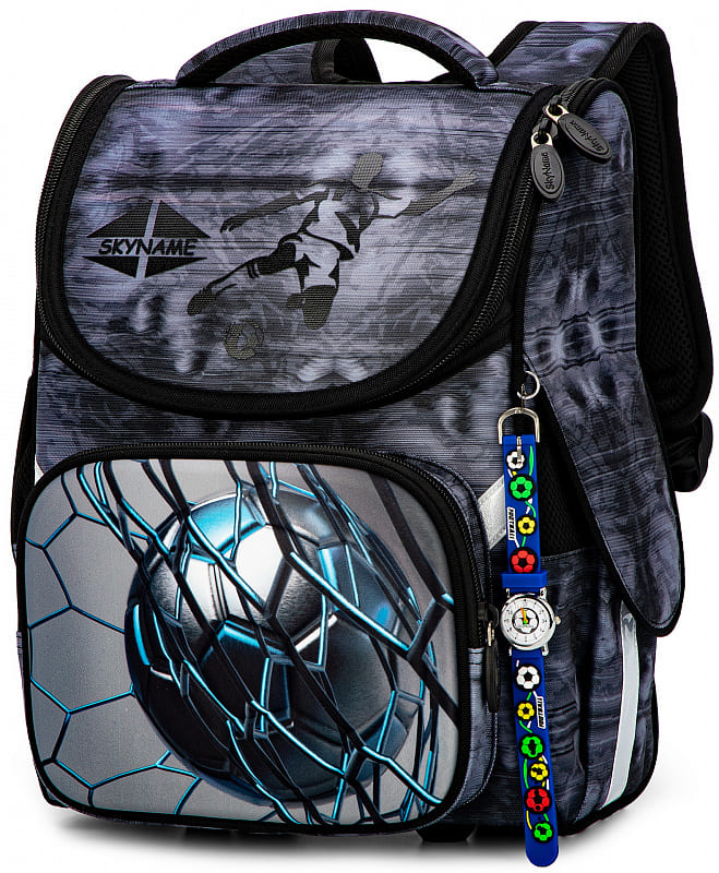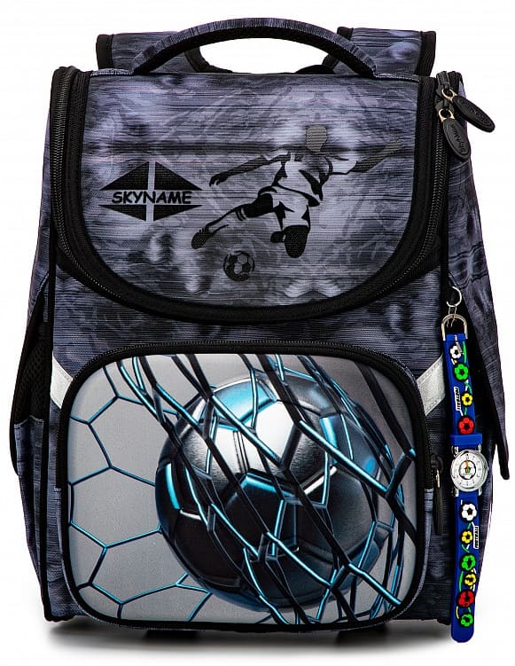 Школьный ранец для мальчика первоклассника и учеников 2-4 классов SkyName 2085 имеет классическую форму и разборную конструкцию, позволяющую раскладывать ранец в плоскую форму, когда он не используется. Он имеет немаркую серо-черную расцветку с голубыми вставками и украшен стильным 3D-рисунком футбольного мяча.
