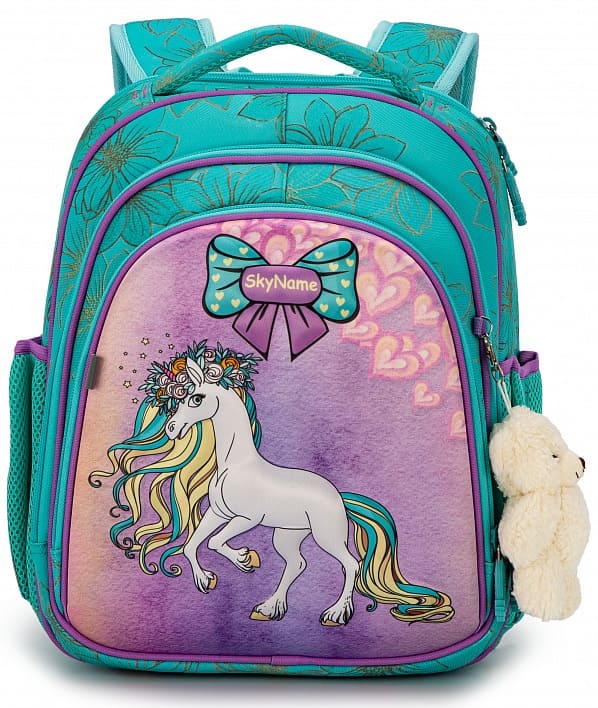 Школьный ранец для девочки первоклассницы и учениц 2-4 классов SkyName 5022 имеет жесткую каркасную конструкцию. Он имеет зелено-сиреневую расцветку и украшен рисунком единорога.
