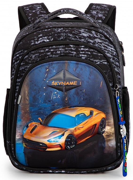 Школьный ранец для мальчика-первоклассника и учеников 2-4 классов SkyName 5027 имеет жесткую каркасную конструкцию. Он имеет немаркую расцветку и украшен рисунком яркой оранжевой гоночной машины на торцевом кармане.