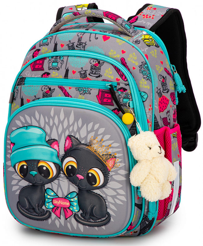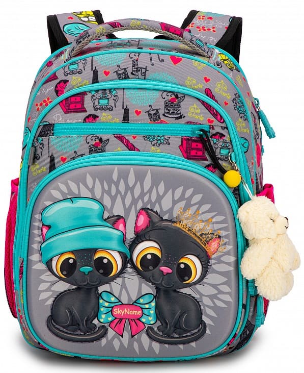 Школьный ранец для девочки первоклассницы и учениц 2-4 классов SkyName 7012 имеет жесткую каркасную конструкцию. Он имеет стильную серую расцветку с голубыми вставками и украшен рисунком двух черных котят торцевом кармане.