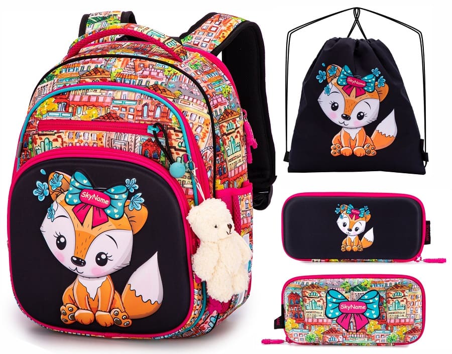 Школьный ранец для девочки первоклассницы и учениц 2-4 классов SkyName 7013 имеет жесткую каркасную конструкцию. Ранец изготовлен из современных прочных материалов, что позволило довести вес ранца до 890 грамм. Он имеет стильную яркую расцветку и украшен рисунком милого рыжего лисенка на торцевом кармане.