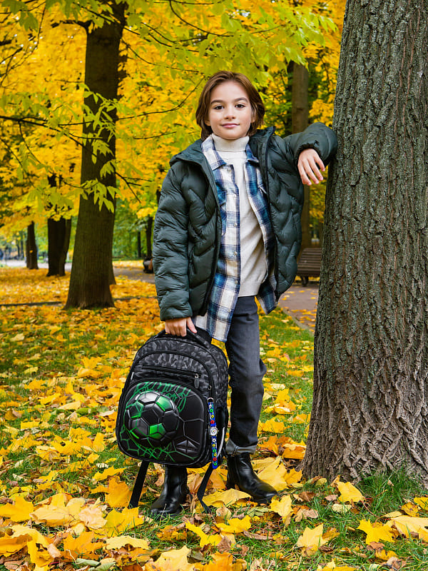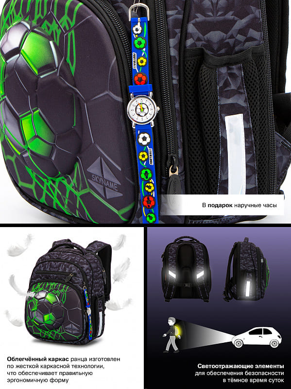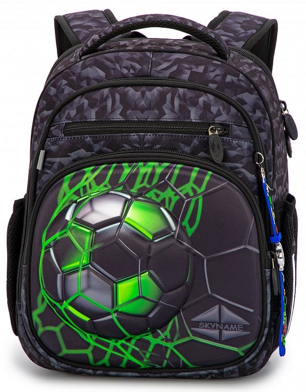 Школьный ранец для мальчика-первоклассника и учеников 2-4 классов SkyName 7018 имеет жесткую каркасную конструкцию. Он имеет немаркую черно-серую расцветку и украшен контрастным зеленым 3D-рисунком футбольного мяча на торцевом кармане.