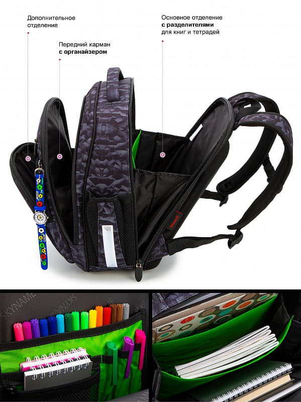 - Большое основное отделение у спины с тканевыми разделителями для школьных принадлежностей;