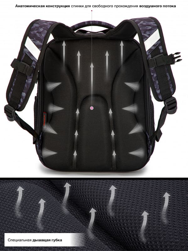 - Светоотражающие элементы на передней, задней и боковых частях ранца;