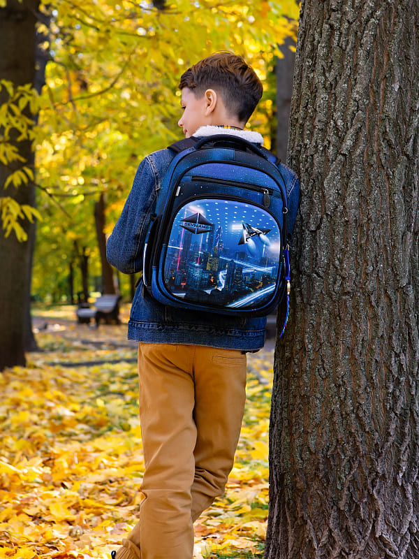 - Большое основное отделение у спины с тканевыми разделителями для школьных принадлежностей;