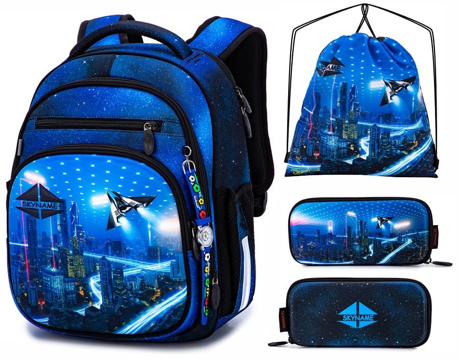 Школьный ранец для мальчика-первоклассника и учеников 2-4 классов SkyName 7020 имеет жесткую каркасную конструкцию. Ранец изготовлен из современных прочных материалов, что позволило довести вес ранца до 890 грамм. Он имеет строгую темно-синюю расцветку и украшен 3D-рисунком ночного города будущего.