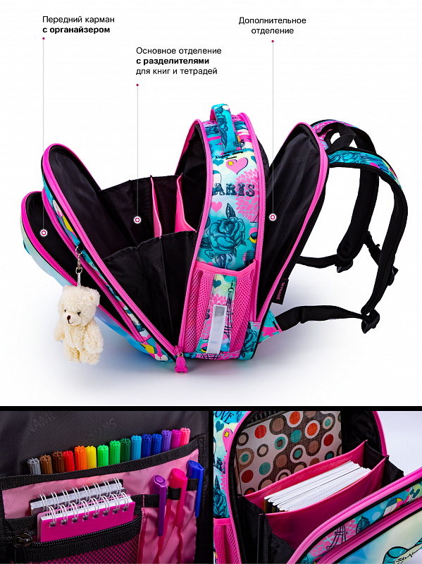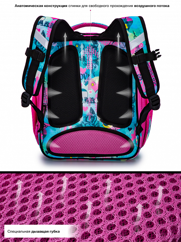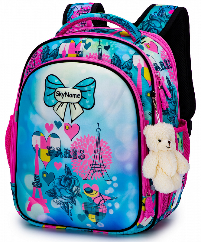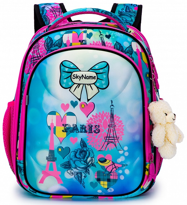 Школьный ранец для девочки первоклассницы и учениц 2-4 классов SkyName R4-411 Paris сделан по жестко-каркасной технологии. Он имеет яркую розово-голубую расцветку и украшен рисунками Эйфелевой башни и сердечек.