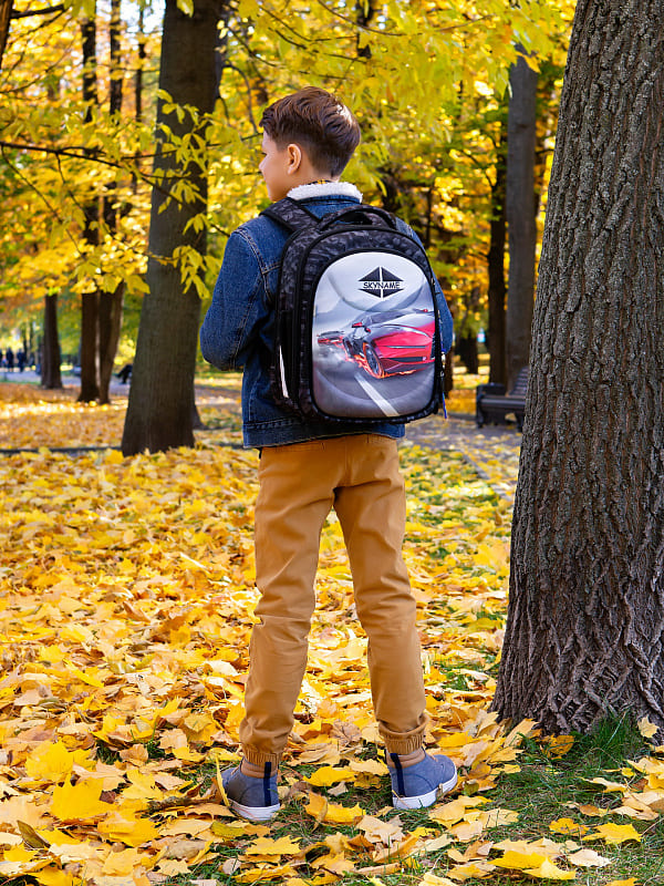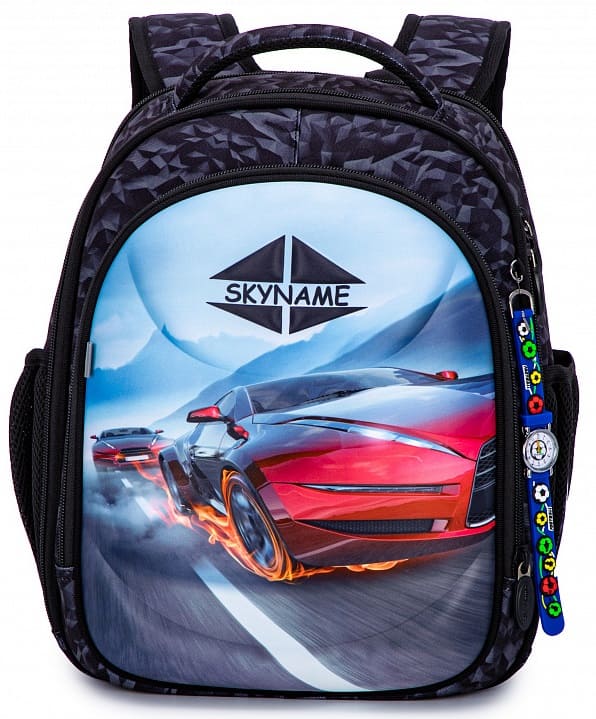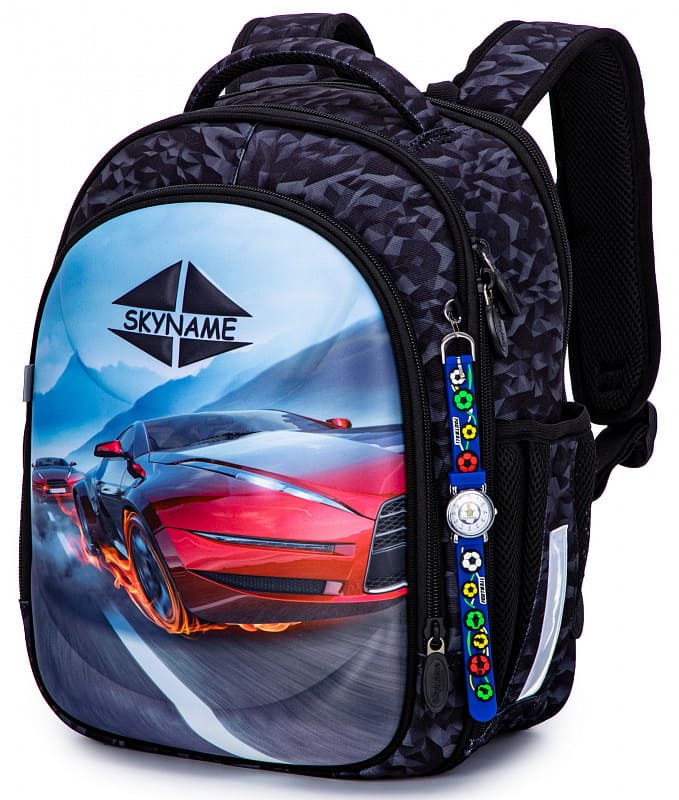 Школьный ранец для первоклассника и учеников 2-4 классов SkyName R4-417 сделан по жестко-каркасной технологии. Он имеет немаркую серо-черную расцветку и украшен ярким рисунком мчащегося красного спорткара.