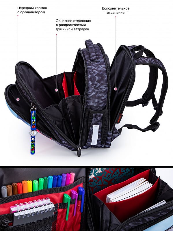 - Два отделения: большое основное с тканевыми разделителями для школьных принадлежностей, дополнительное у спины для папки для труда и альбома для рисования;