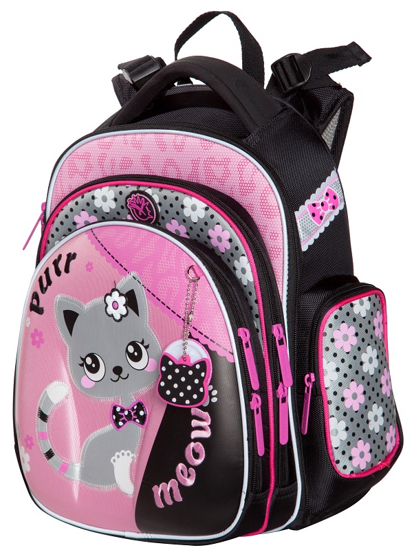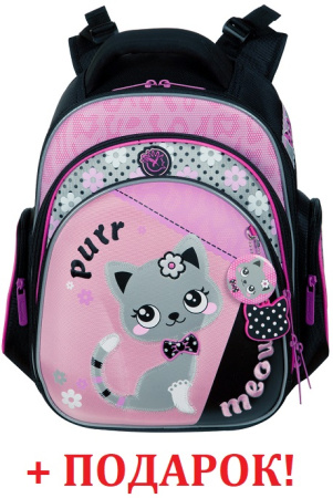 Школьный рюкзак для девочек 1-3 класса Hummingbird TK38 Purr Meow из серии Kids. Главная особенность рюкзаков серии KIDS - жесткий формованный каркас, делающий похожими эти рюкзаки на ранцы. Единственное их отличие от ранцев - отсутствие верхнего клапана. Модель TK38 имеет розово-черную расцветку, а фронт рюкзака украшен рисунком серой кошечки.