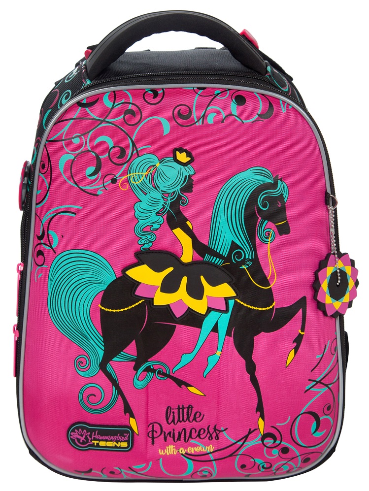 Школьный рюкзак для девочек Hummingbird T109 Little Princess With a Crewn относится к серии T (Teens). Основная особенность рюкзаков этой серии - жесткие боковины и фронт, что делает их очень похожими на ранцы. Рюкзак имеет яркую розово-черную расцветку и украшен рисунком прекрасной принцессы с зелеными волосами на коне. В дополнение к стильному оформлению на ранец нанесена надпись: "Маленькая принцесса в короне" на английском языке.