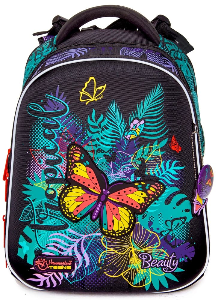 Школьный рюкзак для девочек 3-8 классов с ортопедический спинкой Hummingbird T118 Tropical Beauty относится к серии T (Teens). Основная особенность рюкзаков этой серии - формованная конструкция каркаса, что делает их очень похожими на ранцы, в которых все содержимое защищено твердыми стенками. Данная модель имеет немаркую черную расцветку и украшена ярким контрастным принтом бабочек порхающих над цветами. Основные конструктивные особенности формованного рюкзака Hummingbird T118 Tropical Beauty серии Teens следующие: